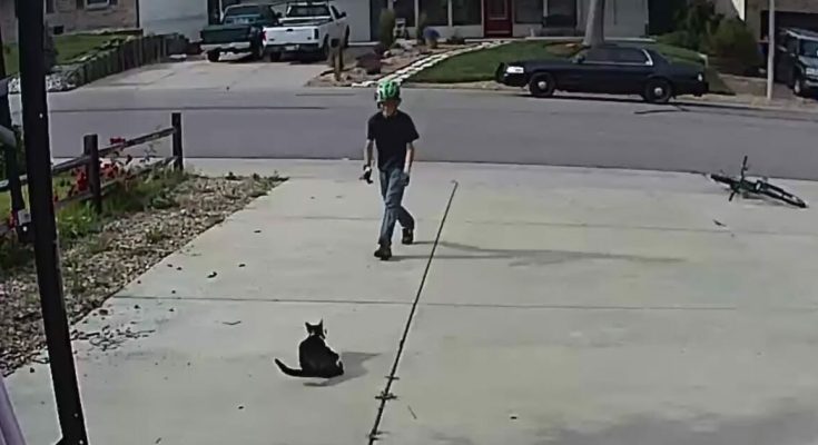 A boy was captured on camera visiting the cat every day, undeterred by his appearance, and sits with him, petting and playing with him.